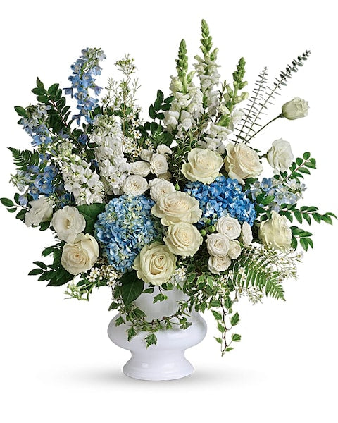 A treasured tribute to your beloved, this gorgeously grand bouquet of soft blue hydrangea and pure white roses is reminiscent of a clear sky, a hopeful reminder of life and love.